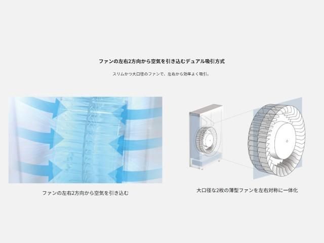 リムかつ大口径のファンで、左右から効率よく吸引。花粉集じん量アップ。(※設置条件には、一部制約があります。どの設置場所や向きでも同じ清浄効果を保証するものではありません。)