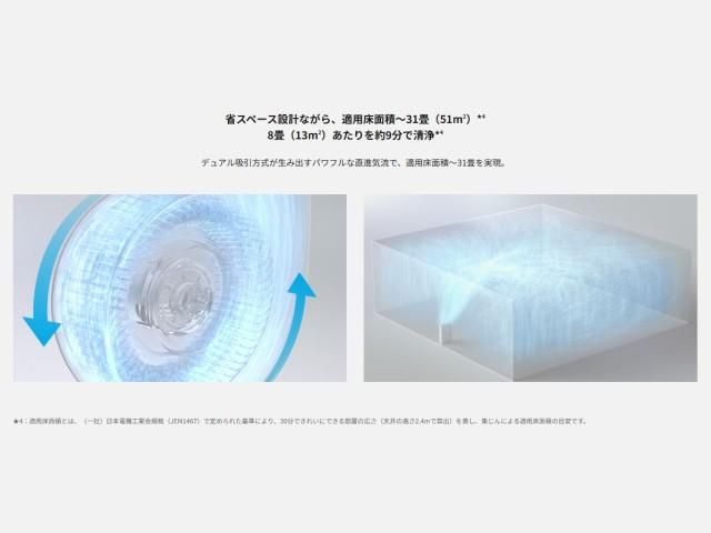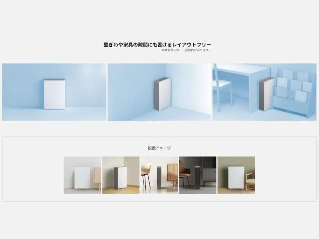 設置面積は従来品と比べて省スペース化。(※加湿機能はありません。)さらに新開発のデュアル吸引方式でパワフルに集じん。壁ぎわや家具の隙間にも置けるレイアウトフリー(※設置条件には、一部制約があります。)な空気清浄機です。