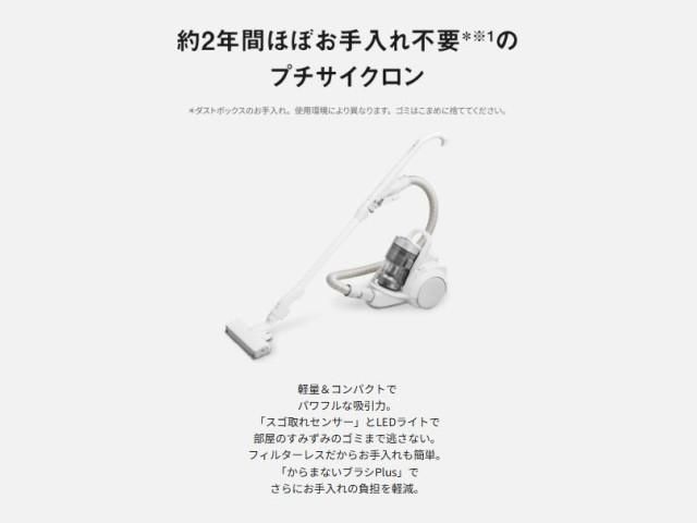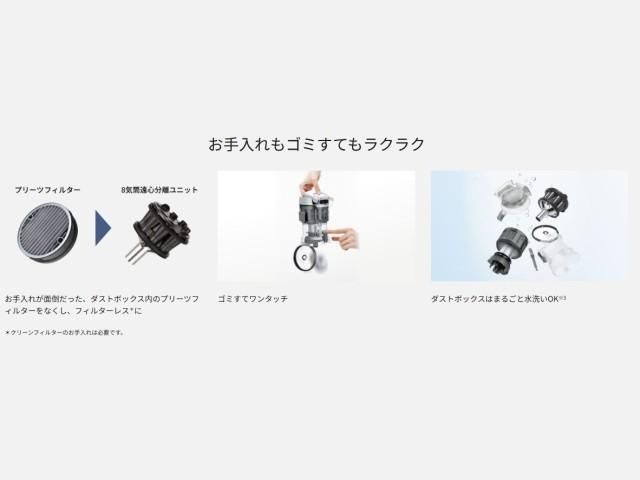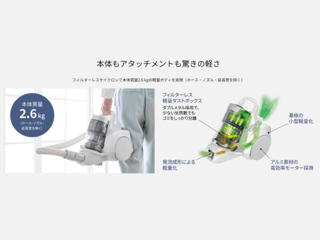 フィルターレスサイクロンで本体質量2.6 kgの軽量ボディを実現(ホース・ノズル・延長管を除く)また、お手入れが面倒だった、ダストボックス内のプリーツフィルターをなくし、フィルターレスに。(※クリーンフィルターのお手入れは必要です。)ゴミすてワンタッチ。ダストボックスはまるごと水洗いOK。