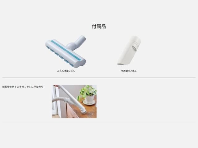 ・付属品:ワンタッチ手元ブラシ,ふとん清潔ノズル,すき間用ノズル