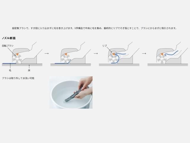 髪の毛もペットの毛もほとんどからまず、ノズルのお手入れがラク。超密集ブラシで、すき間に入り込まずに毛を巻き上げます。V字構造で中央に毛を集め、最終的にリブでそぎ落とすことで、ブラシにからまずに吸引されます。