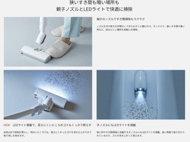 ノズルを付け替える手間なくペダルをポンと踏むだけ。子ノズルで、狭いすき間や高い所など、届きにくい場所も気軽にお掃除。また、白色LEDで床面を照らし、明るいところでも、見えにくかったゴミを浮かび上がらせて取り残しを防ぎます。
