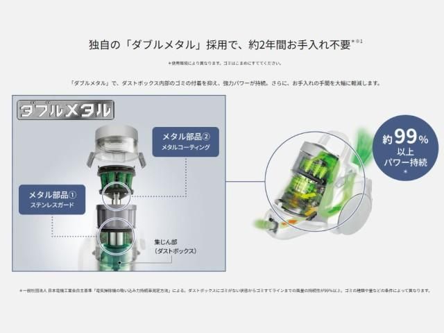 「ダブルメタル」で、ダストボックス内部のゴミの付着を抑え、強力パワーが持続。さらに、お手入れの手間を大幅に軽減します。(※使用環境により異なります。ゴミはこまめにすててください。)