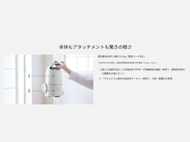 軽さは驚きの2.0 kg(電源コード含む)。軽さと強度を両立した先端材料 PPFRP(PP繊維強化樹脂)採用で、樹脂成形部分の質量を大幅にカット。「アルミニウム素材の高効率モーター」採用で、小型・軽量化を実現。軽くて持ち運びしやすいから、家中のお掃除がスムーズに。