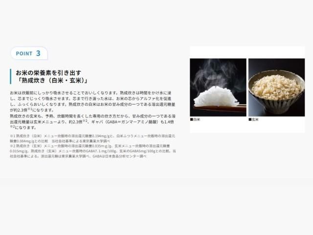お米は炊飯前にしっかり吸水させることでおいしくなります。熟成炊きは時間をかけ水に浸し、芯までじっくり吸水させます。芯まで行き渡った水は、お米の芯からアルファ化を促進し、ふっくらおいしくなります。熟成炊きの白米はお米の甘み成分の一つである溶出還元糖量がアップ。熟成炊きの玄米も、予熱、炊飯時間を長くした専用の炊き方だから、甘み成分の一つである溶出還元糖量とギャバ(GABA=ガンマーアミノ酪酸)は玄米メニューよりアップ。