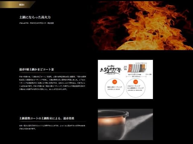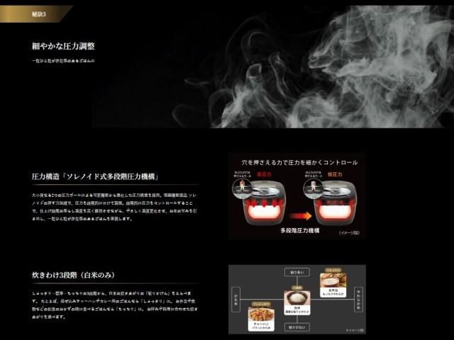 土鍋にならった高火力。ごはんの甘み・旨みを引き出す高火力・遠赤効果。内なべ外側には、「土鍋かまどコート」を採用。上部には熱伝導性の高い銅素材、下部には蓄熱性の高い土鍋素材のコーティングを施し、土鍋の理想に近い蓄熱性を再現しました。土鍋蓄熱コートの土鍋粉末による、遠赤効果。お米一粒ひと粒を芯までじっくりと加熱することができ、ふっくらと粒のそろった旨みのあるごはんに炊きあげます。土鍋由来のやさしい泡で、ごはんの粒立ちを守るやさしい泡立ち。約2,250個の細やかな凸形状で泡立ちを強化させ炊飯に適した沸とうの泡立ちと対流を生み出し、土鍋のような細やかな泡立ちでお米一粒ひと粒を包み込み、ふっくらした炊きあがりに。また、細やかな圧力調整で一粒ひと粒が存在感のあるごはんに。