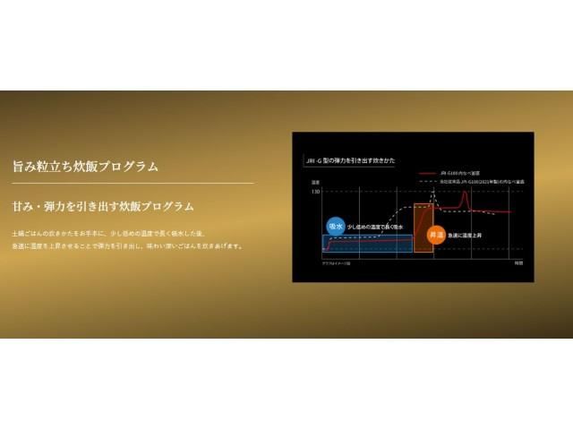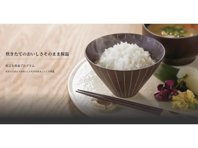 粒立ち保温プログラム。炊きたてのようなおいしさをそのままふっくら保温。お米の水分を保ち、パサつきにくく、みずみずしいごはんへ。炊飯後時間が経過してもみずみずしさを保ち、ごはんのパサつきをおさえます。