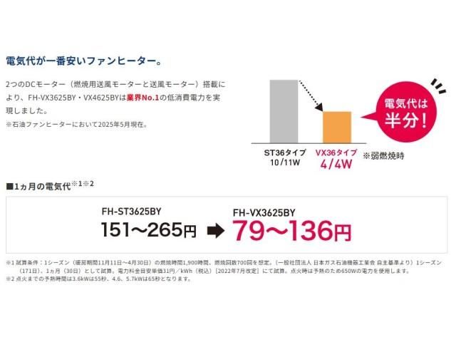 2つのDCモーター(燃焼用送風モーターと送風モーター)搭載により、業界No.1の低消費電力を実現。(※石油ファンヒーターにおいて2025年5月現在。)