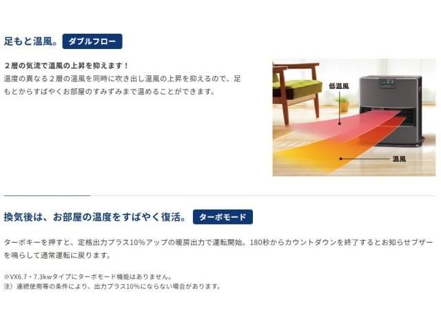 ダブルフローで温度の異なる2層の温風を同時に吹き出し温風の上昇を抑えるので、足もとからすばやくお部屋のすみずみまで温めることができます。ターボキーを押すと、定格出力プラス10%アップの暖房出力で運転開始。180秒からカウントダウンを終了するとお知らせブザーを鳴らして通常運転に戻ります。また、操作部は大型白文字バックライト液晶搭載。