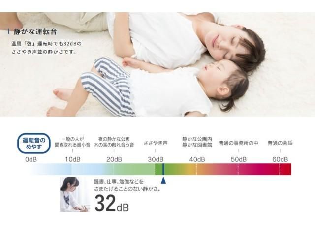 温風「強」運転時でも32dBのささやき声並の静かさです。
