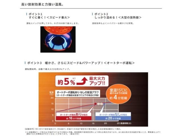 運転開始時、自動で最大火力を約5%アップ。(※自動運転モード時のみ/室温が15℃以下の場合に作動。使用環境や使用状況等により異なる場合があります。また着火時の室内温度が低いとき、燃焼量を上げて運転するため燃焼音が大きくなることがあります。(最長30分))