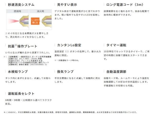 ・安全装置及びその他装置:不完全燃焼防止装置、対震自動消火装置、停電安全装置、過熱防止装置、燃焼制御装置、点火安全装置、消し忘れ消火装置、室温異常高温防止装置、水検知装置